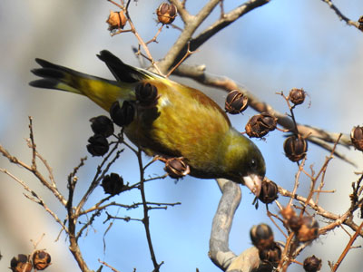 1/19 西浜公園内ではカワラヒワがサルスベリの裂開した果実から種子を啄んでいました。