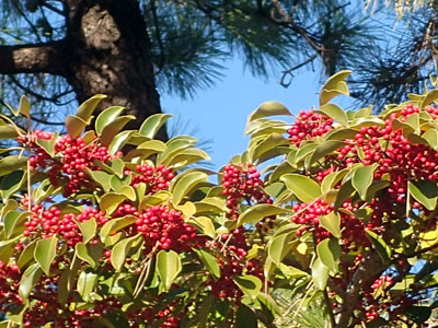 1/9 今年も西浜公園のテニスコート脇の植え込みではクチナシの果実が橙色に色づき始めていました。公園内ではクロガネモチの果実が鈴なりに。
