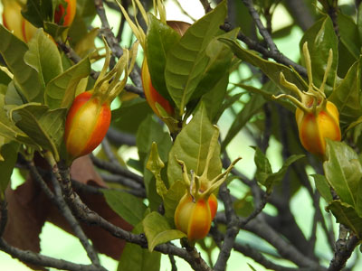 前年枝の葉腋からでた短い柄の先に橙黄色の花をつける。 花弁は4個、線形で長さ2cm。ガク片も4個。 |