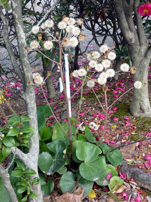 秋に黄色い花を咲かせるツワブキに 褐色の丸い冠毛の果実(そう果)が残っていました。 |