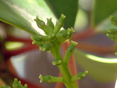 こちらは雌花。 子房は狭卵形で長さ1〜1.5mm。 柱頭は3、4個、淡黄色。 |