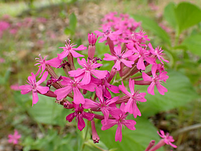茎の高さ50cm、上部の節間に 褐色の粘液を分泌。 花は径1cm、紅色。 花弁5個、花弁に2個づつ 突起状の鱗片がある。 萼の長さは15mmほど。 |