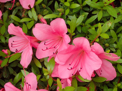 別名サツキツツジ。 他のツツジ類より花期は遅い。 枝先に淡紅紫色の花を1〜2個を付ける。 花冠は直径3.5〜5cmの漏斗形。 雄しべ5本、葯は黒っぽい紫色。 |
