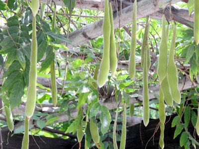 | フジの豆果(果実)は長さ10〜20cm。表面はビロード状の短毛が密生。 | |