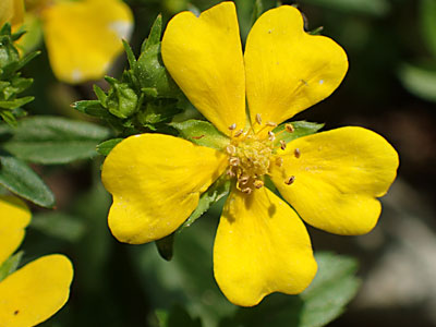 花は径15mmほど、黄色い花弁5個、 雄しべ20本、雌しべ多数ある。 |
