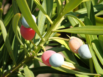 10/26 生垣のイヌマキに赤色の果床、青色の種子が成熟して色づいてきました。