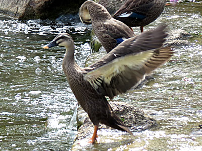 | 巣立ちもまじかでしょうか?羽ばたきの練習をするカルガモ | |