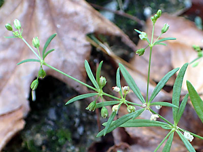 葉は4〜7個ずつ輪生。 花は直径5mmほど葉の基部に輪生。 |