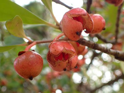 。 果皮は不規則に裂開し、 橙朱色の種子が見えていました。 樹木ウォッチング モッコクのページもご覧ください。 |