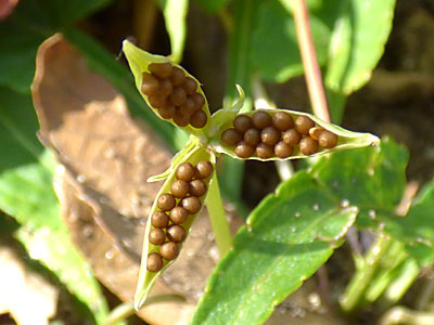 3裂したボート型の果皮に詰まった種子 |