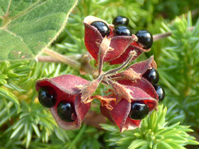 | 青色の種子は直径1cmの球形、赤色の果床は食べられる。 | |