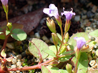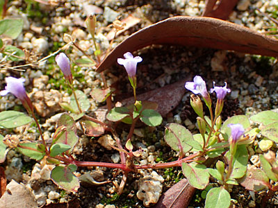 ムラサキサギゴケの花を小さくしたような花 花は長い柄があり 花冠が7mmで上下2唇がある。 |