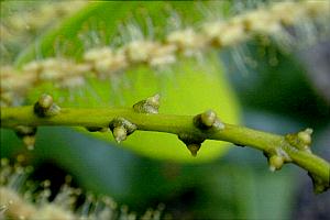 この写真に写っているのは、マテバシイのドングリの赤ちゃん(生後8ヶ月ぐらい)といえるでしょう。2001年の春に受粉して出来た実が2002年の秋に一人前のドングリに成長します。2年がかりで出来るので、2年成のドングリです。