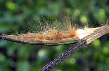 キョウチクトウの果実は袋果 熟すと縦に裂けて種子を出す。 |