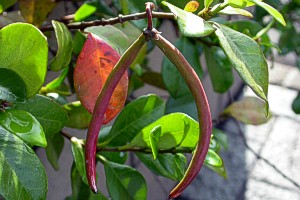 公園樹、街路樹としてキョウチクトウの木は何処にでも植えられて、赤、白、ピンク色の花が満開になっている様子をよく見ます。キョウチクトウの果実を観察しました。