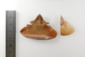 種子(左)には翼がついています。 扇形の種鱗(右) 種子がおさまっていたところがへこんで見えています。 |