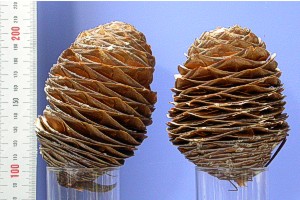左写真の約一ヶ月後の球果 鱗片状の種鱗が乾燥して割れ 幅が1.5倍ほどに広がった