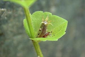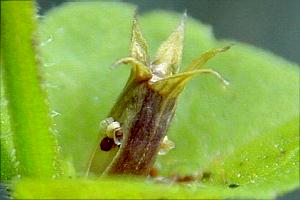 花も無柄で葉のもとに1〜3個ずつ付いています。 はじめは閉鎖花だけをつけ、のちに普通の花をつけています。 六甲森林植物園 2001/6/12撮影 |