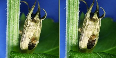 左の緑色の果実は閉鎖花の果実。 閉鎖花のがく片は3個。 右の白い果実はふつうの花の果実。 ふつうの花のがく片は5個。 2004/5/25撮影 |