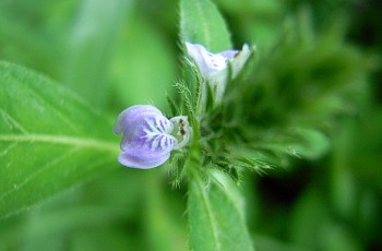 花冠は上下2唇に分れ、 上唇は白色、下唇は淡紫色で白い斑紋が見える |