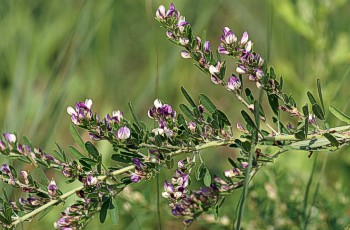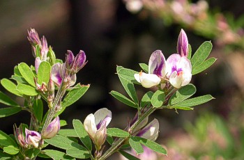 日当たりのいい草原に生える多年草 茎は直立、多くの葉が隙間なく付く 花は葉の基部に数個づつ付き、 黄白色で旗弁に紫色の斑(ふ)がある |