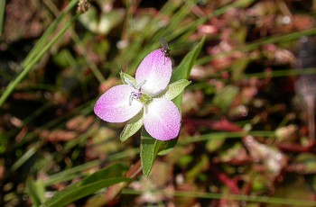 花は径約13mm、白色で先がピンク色。 花弁3、がく片3、おしべ6、めしべ1からなる。 |