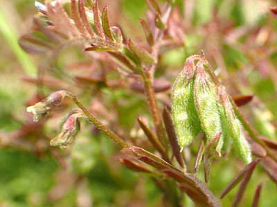 | 花の長さは3〜4mm、淡紫色。 | 豆果は短毛におおわれる。 |
