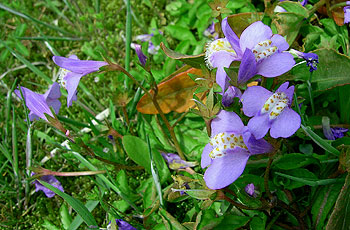 花は淡紫色か淡紅紫色で上下2唇に分かれ、 下唇の上面には2個の膨らみがあり、こん棒状の白い毛と黄褐色の斑紋がある。 |