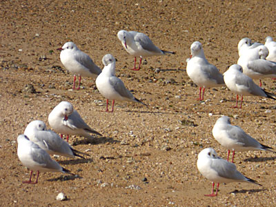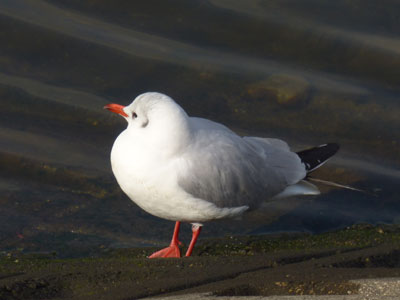 冬鳥のユリカモメは 背面が淡青灰色で体が白っぽく見え、くちばしと脚は赤い。 |