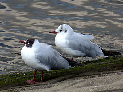 | 頭部が夏羽に黒く変わりつつあるユリカモメ | |