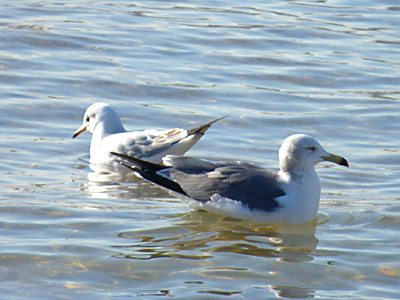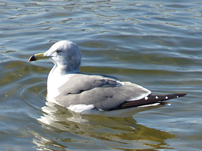 大型のカモメ 背は青灰色、尾の先は黒く白斑がある。 嘴は黄色く赤斑が目立っている。 |