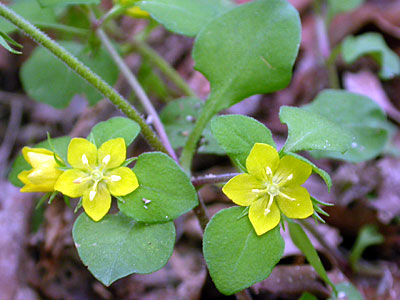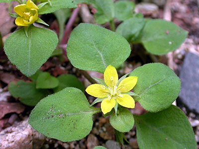 庭先などにも生える小型の多年草。 葉は対生、ほぼ卵形に近く、基部は急に長さ5〜10mmの柄にうつる。 花冠は黄色、径5〜7mm 、雄しべ5本が花冠の裂片と対生。 |