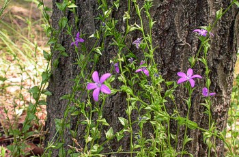 花は枝先に1個ずつ付く、径1.5cm 花冠は淡紫色で5裂、おしべ5、めしべ1、花柱の先は3裂 茎は角ばって細く、高さ20〜40cm |