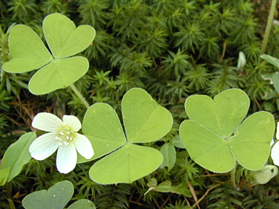 | 葉はハート型の3小葉からなり、小葉には紫かっ色の小点が散らばる。 | |