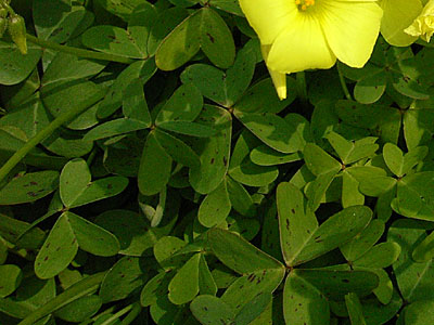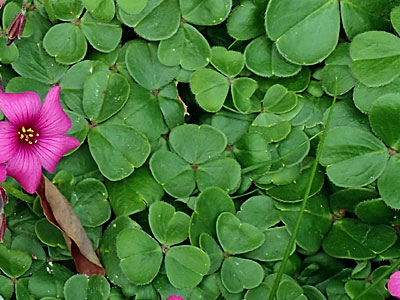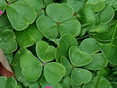 ベニカタバミの葉は直径約2cm。小葉の切れ込みは小さく、 そして葉は背が伸びず、地面にすき間なくべたッと広がって行く。 |