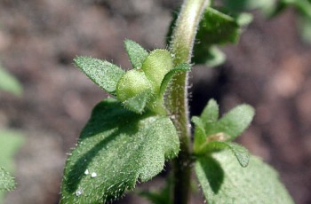 1年草、茎は立ち、走出枝は出さない。 花冠は長さ10mm〜12mm。 上唇は紫色、下唇はわずかに紫色をおびた白色。 |