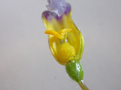 雄しべ3の下半分で合生(黄色い腺毛)し、 その下に緑色の子房。 |