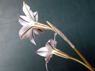 花茎の先に1花をつける。 花茎の途中にうすい膜状の苞葉が対生。 花被の下部は合生、内面に雄しべ6。 |