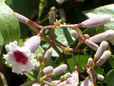 花冠の外側は白色、内部は暗赤色。 子房は花冠の下に突き出して 子房下位となっている。 |