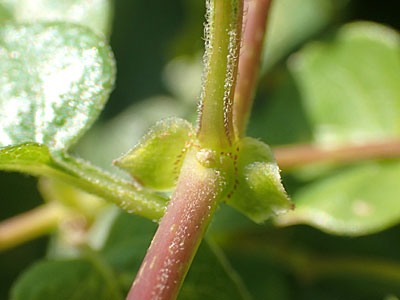 茎の上に鱗片があり、左右の托葉が合生したもので 葉間托葉(合生托葉)とよばれている。 |