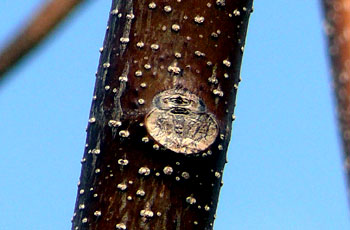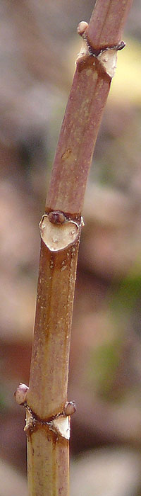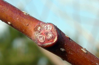 冬芽。托葉痕が枝を一周する。 下方に見えるのは側芽、葉痕は半円形 |
