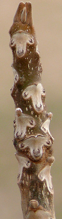葉痕は三角形、ハート型、卵形、半円形など色々。 葉痕の上にある側芽は小さい 維管束痕は5〜9個 |