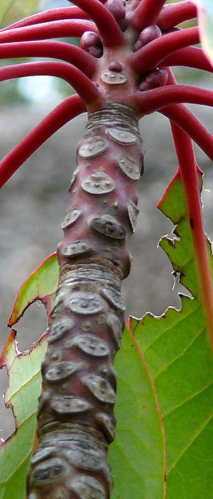 葉痕は三角形または半円形。 維管束痕は3個。 |